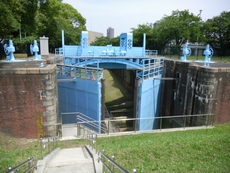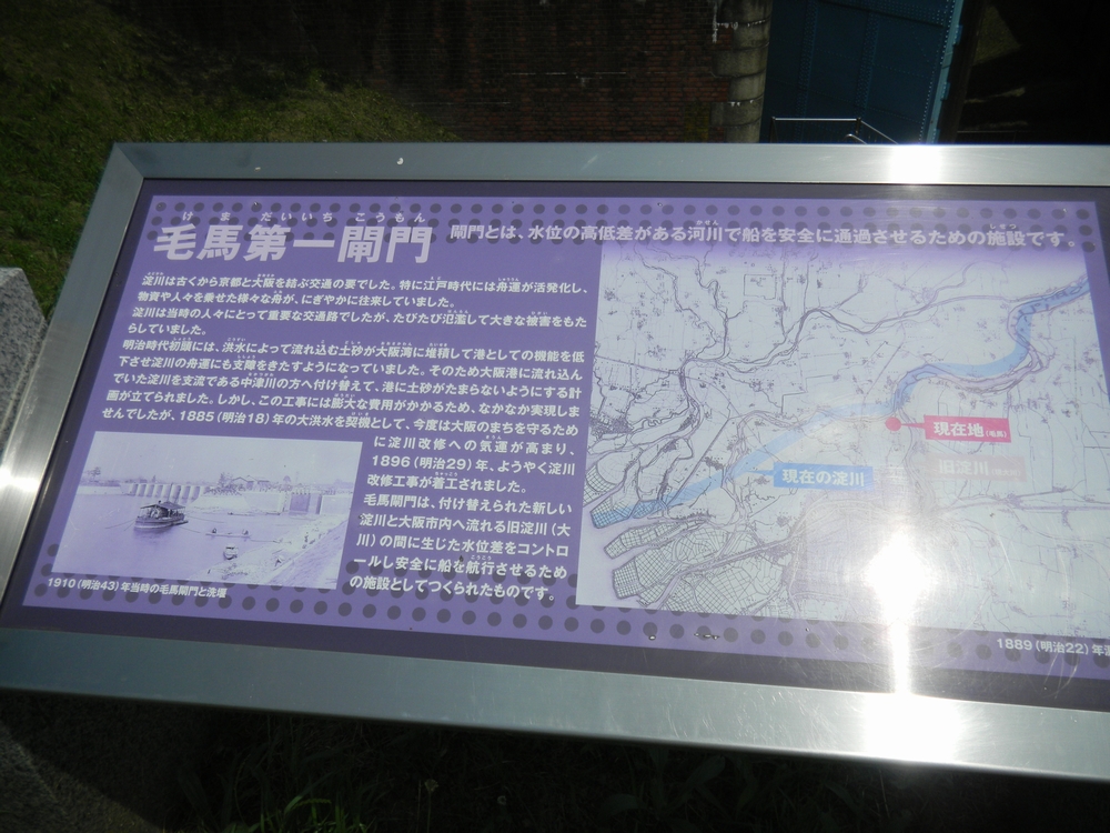 毛馬第一閘門 明治40年(1907年) 淀川と大阪市内を流れる大川との水位差を2重水門にすることで、水位調整 を行い船の往来を可能とした設備 水都大阪を支えたひとつですね >> 毛馬第一閘門の説明パネル