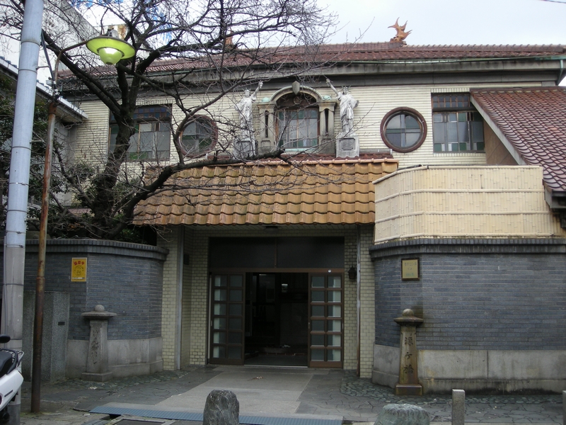 大阪市生野区林寺1丁目 源ヶ橋温泉(げんがはしおんせん) 昭和10年(1935) 環状線寺田町駅 昭和の中、頃寺田町の源ケ橋商店街から生野商店街と、 とっても長居商店街には母親に連れられてぶらぶら、 とても長い商店街の東の端っこには映画館があり、三本 だての白黒ちゃんばら映画を見た気憶が残っています あれから40年以上経った2008年12月の暮れ ちょっとした御用で寺田町をうろうろ 「せっかくだから」の同伴者の一言で、源ケ橋商店街を歩 いたのですが、子供の頃の多くの人が様々なお店を行き交う 風景は様変わりして、シャッターが多く見られる寂しげな様子 そんな景色を見ながらぶらぶらしながら、子供の頃に見かけた 建物見つけました 大阪市内には、昭和時代銭湯が多くまた銭湯という特殊建築物 の特性からオーナーさまの意向を反映した趣のある建物も多く ありました この源ケ橋温泉も外観だけでもとっても風情のある素敵な建物 です お風呂屋さん(銭湯)では、第一号の国登録有形文化財だそうです ::: photo 2008/12 ::: 撮影場所