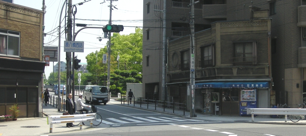 大阪市北区天満橋1丁目 源八橋西詰風景 石黒商店 信号機の向こう側は、大川を渡る源八橋です この源八橋は、昭和11年に完成しましたが、それまでは大阪市営の渡し船が行き交う源八の渡として 川を渡るための多くの人が行き交った場所だったのでしょう そんな場所に残るこの建物、たぶん橋が完成する以前からの往来を見守っていたのでしょう ::: photo 2009/4 ::: 撮影場所